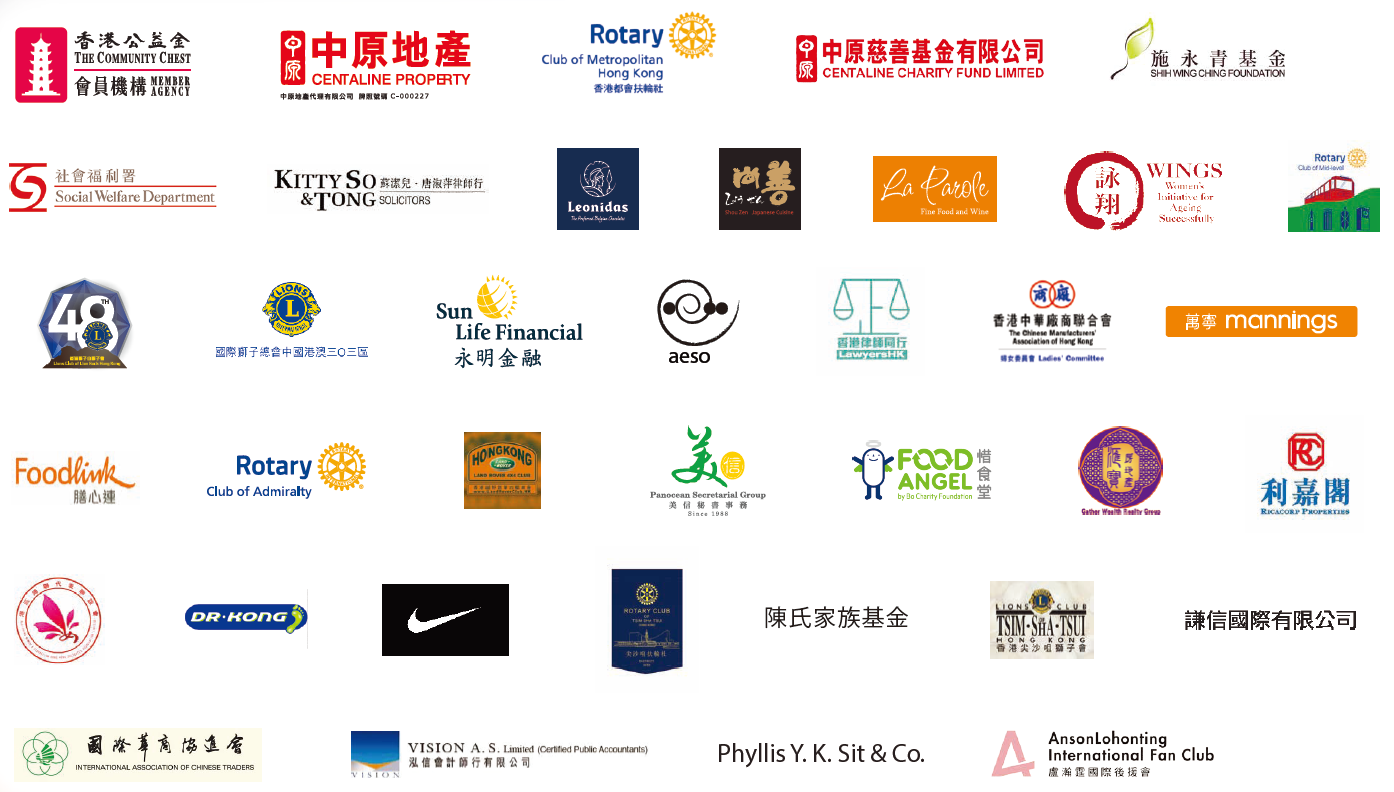 ( 排名不分先後):香港公益金、中原慈善基金、施永青基金有限公司、香港律師同行、港區婦聯代表聯誼會、金鐘扶輪社、半山區扶輪社、尖沙咀扶輪社、惜食堂、膳心連、香港獅子山獅子會、國際獅子總會港澳三O 三區、中區獅子會、尖沙咀獅子會、國際華商協進會、香港中華廠商聯合會、Hermes、牛奶公司 – 萬寧、牛奶公司 – 惠康、Dr. Kong、NIKE、陳氏家族慈善基金、詠翔( 香港)、盧瀚霆國際後援會、美信秘書事務、蘇潔兒, 唐淑萍律師行、北角西布倫團、北宣姐妹、愛心姊妹團、宣道會藍田堂提摩太團、香港嘉興同鄉會、馮鈺聲伉儷、何氏伉儷、何紹章伉儷、邱騰華伉儷、麥瑞琼小姐、陳慈恩女士、吳統志伉儷、楊黃美慧女士、伍錦永先生、林雪艷女士、陳國棟伉儷、陳少忠先生、羅永健先生、Ms. Phyllis Lee、石寶德先生、黎志強伉儷、陳立平伉儷、毛氏伉儷、Ms. Lee Kiew、袁氏伉儷、Ms. Fung Lai Yin、Ms. Lisa Chan、Mr. and Mrs. Martin Ma、Mrs. May Koon。