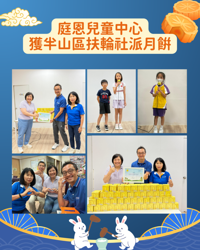 衷心感謝香港半山區扶輪社慷慨捐贈200個月餅給庭恩兒童中心,並於上星期六(9月27日)親臨中心派發給中心小朋友與家長,送上節日祝福。